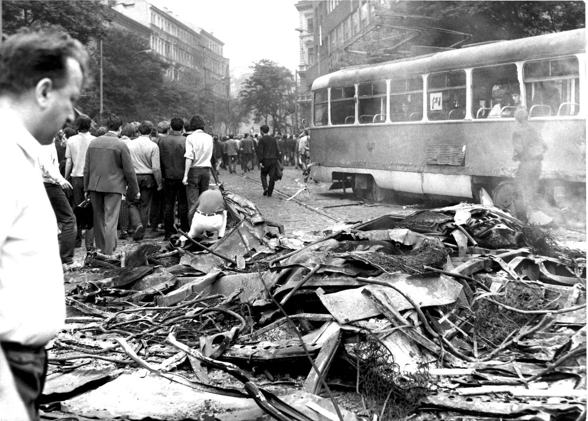 Invaze vojsk Varšavské smlouvy do Československa v srpnu 1968 zásadně změnila vztah Čechů k Rusům. Na snímku jsou doutnající vraky aut na Vinohradské třídě.