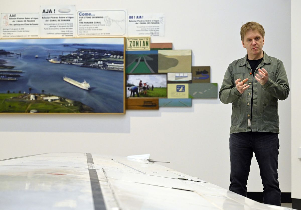 Výstava ale připomíná například i jeho performance na bienále v Panamě, kde slovenský umělec roku 2008 uspořádal házení oblázků přes průplav. Cílem bylo upozornit na geopolitický a historický kontext území.