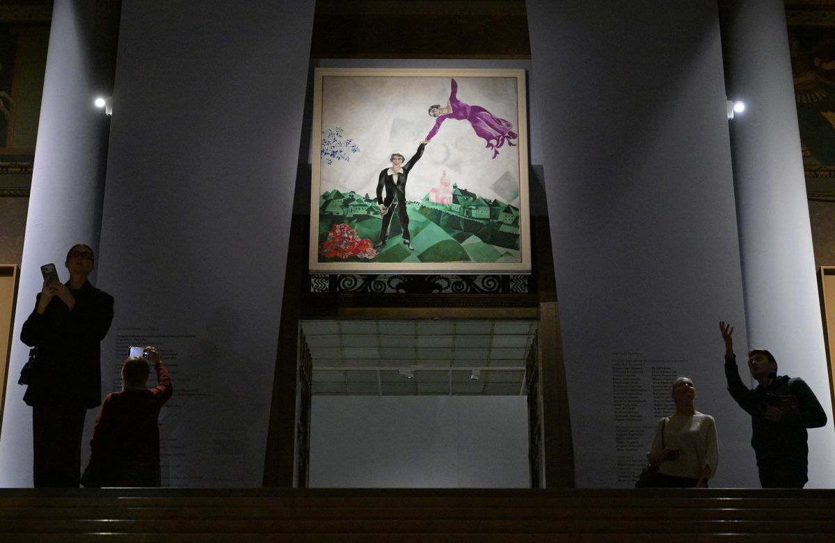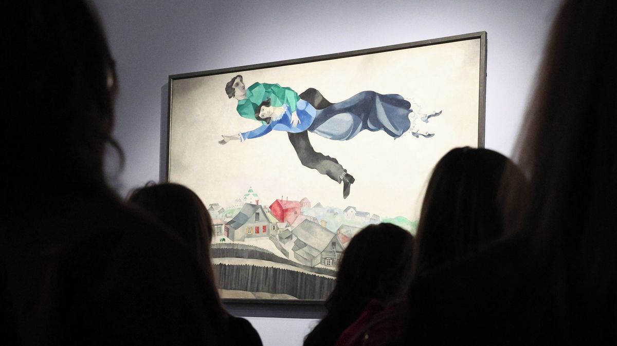 Na výstavě děl Marca Chagalla v Moskvě nechybí ani slavný obraz Promenáda z let 1917 až 1918.