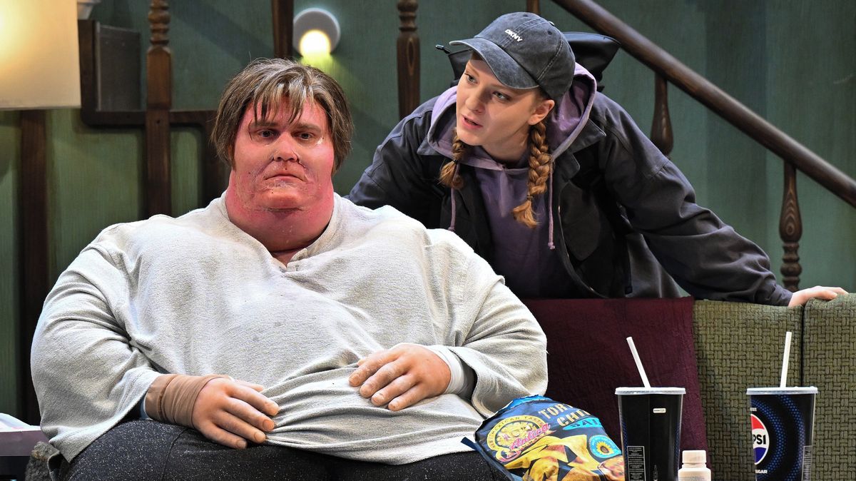 Hrdina Charlie, kterého hraje Martin Dědoch, se doma ujídá k smrti. Vpravo je Alois Bartoň v roli staršího Thomase.