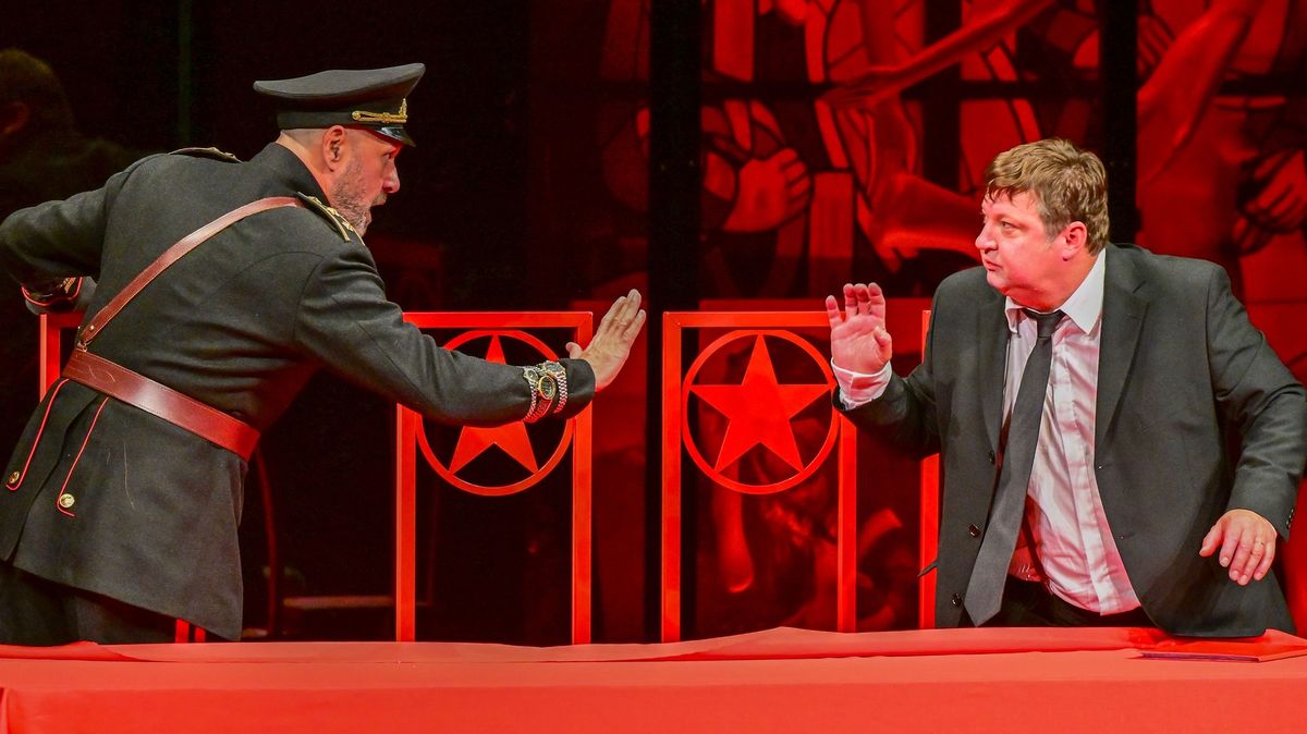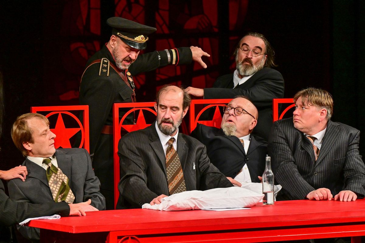 Na snímku z inscenace jsou zleva Martin Siničák jako Vjačeslav Molotov, Petr Halberstadt coby maršál Žukov, Jaromír Dulava v roli Georgije Malenkova, Norbert Komínek jako Lazar Kaganovič, Jan Kolařík coby Lavrentij Berija a Jakub Uličník v roli Nikolaje Bulganina.