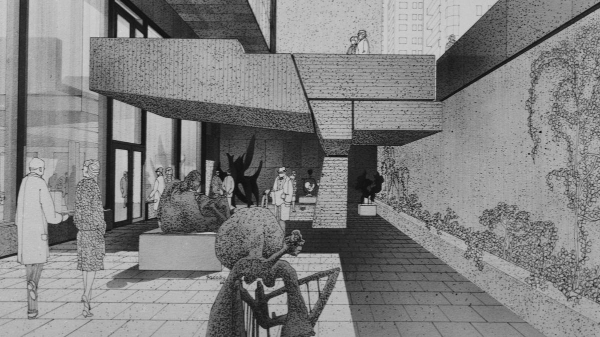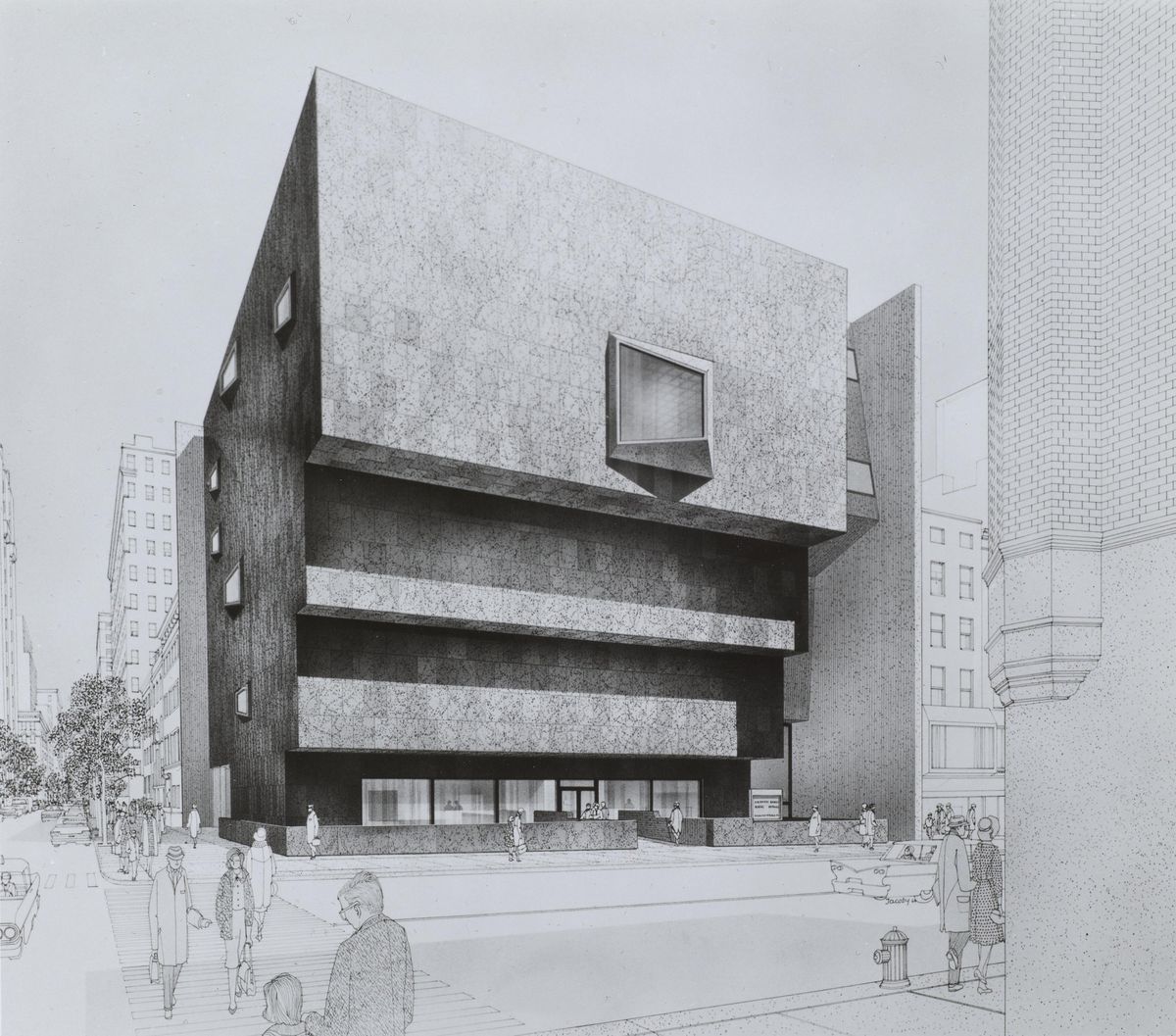 U pětipatrové budovy na Madison Avenue, ulici vyhledávané k uměleckým projektům, Breuer použil podobný model jako pár let před ním Frank Lloyd Wright u nedalekého Guggenheimova muzea. Navrhl stavbu, jež se směrem vzhůru postupně rozšiřuje. I proto ji někteří označovali i za „hranatého Guggenheima“. Díky obkladu ze šedé žuly a hrubému betonu na fasádách se však dost odlišuje.