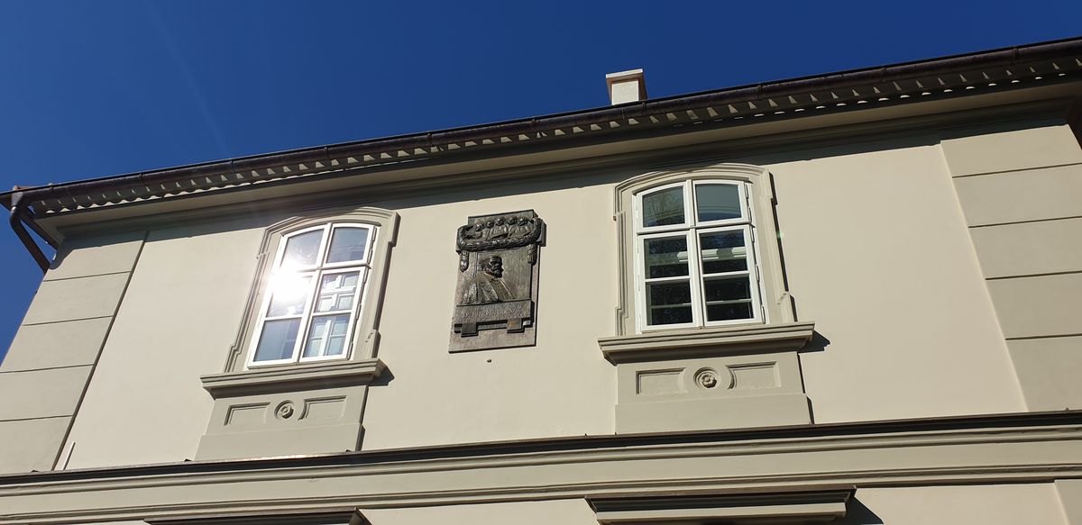 Pamětní deska na fasádě směrem do hlavní ulice.