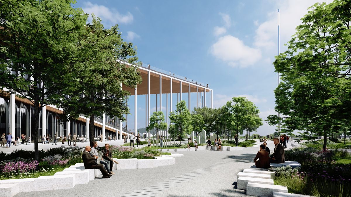 Například na náměstí u západní strany budovy bude výsadba odkazovat na dubové a lužní lesy. Porostou zde duby zimní a topoly bílé a v jejich stínu lesní byliny jako svízel a konvalinka.