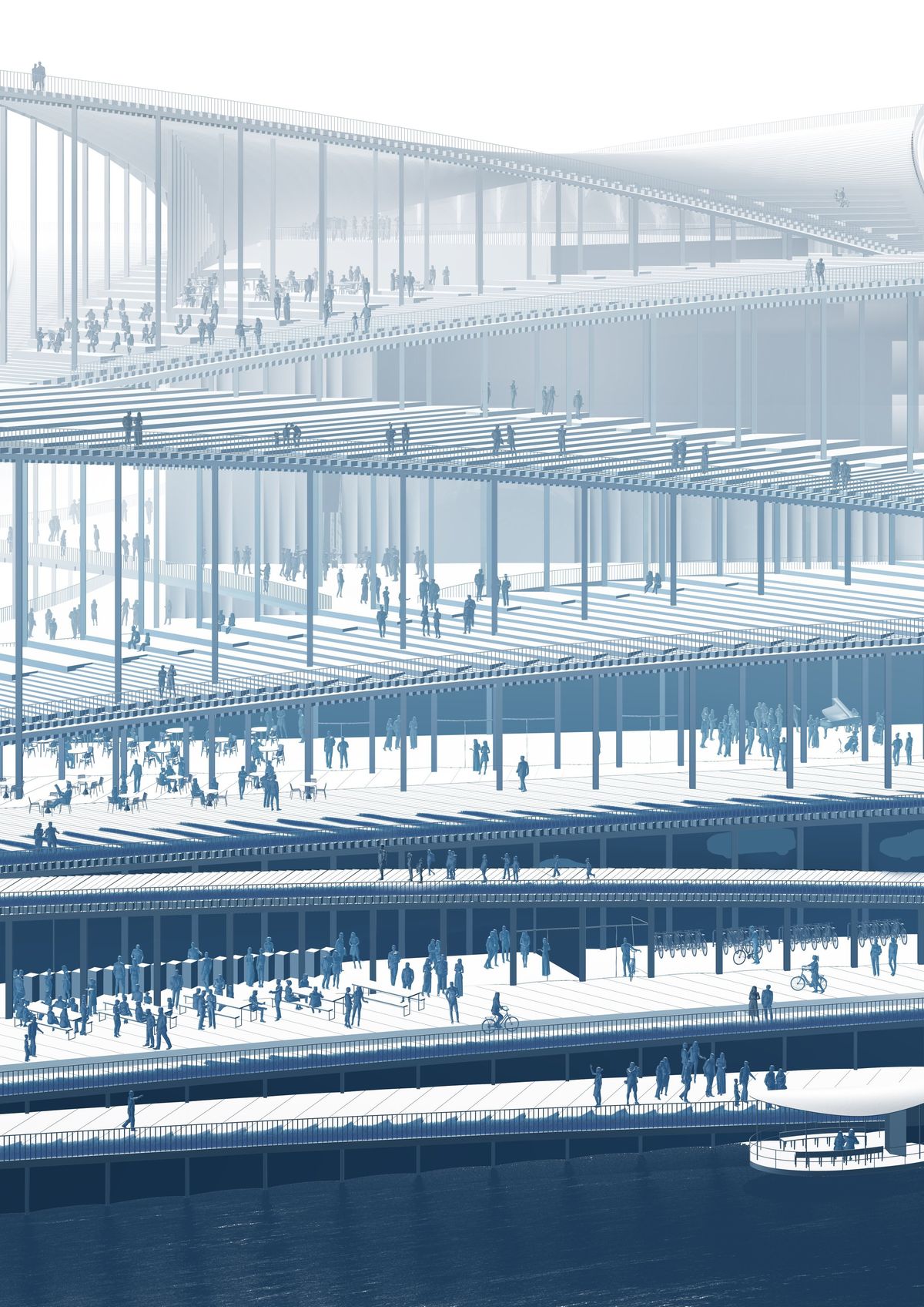 Díky soustavě pochozích teras bude možné z jižní strany projít od nové náplavky u řeky až na střechu. Podobné řešení, tedy spojení budovy s vodou a možnost vystoupat kolem fasády na střechu, už si architekti s úspěchem vyzkoušeli na budově vlastní kanceláře v kodaňském přístavu.