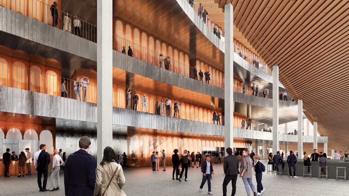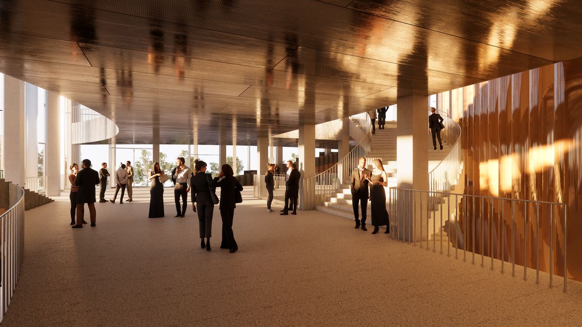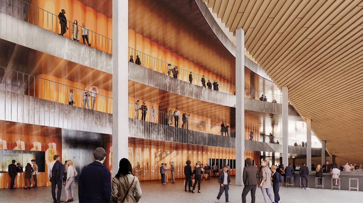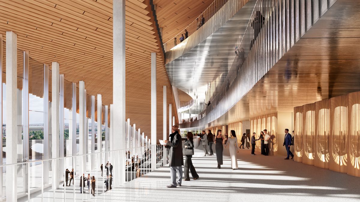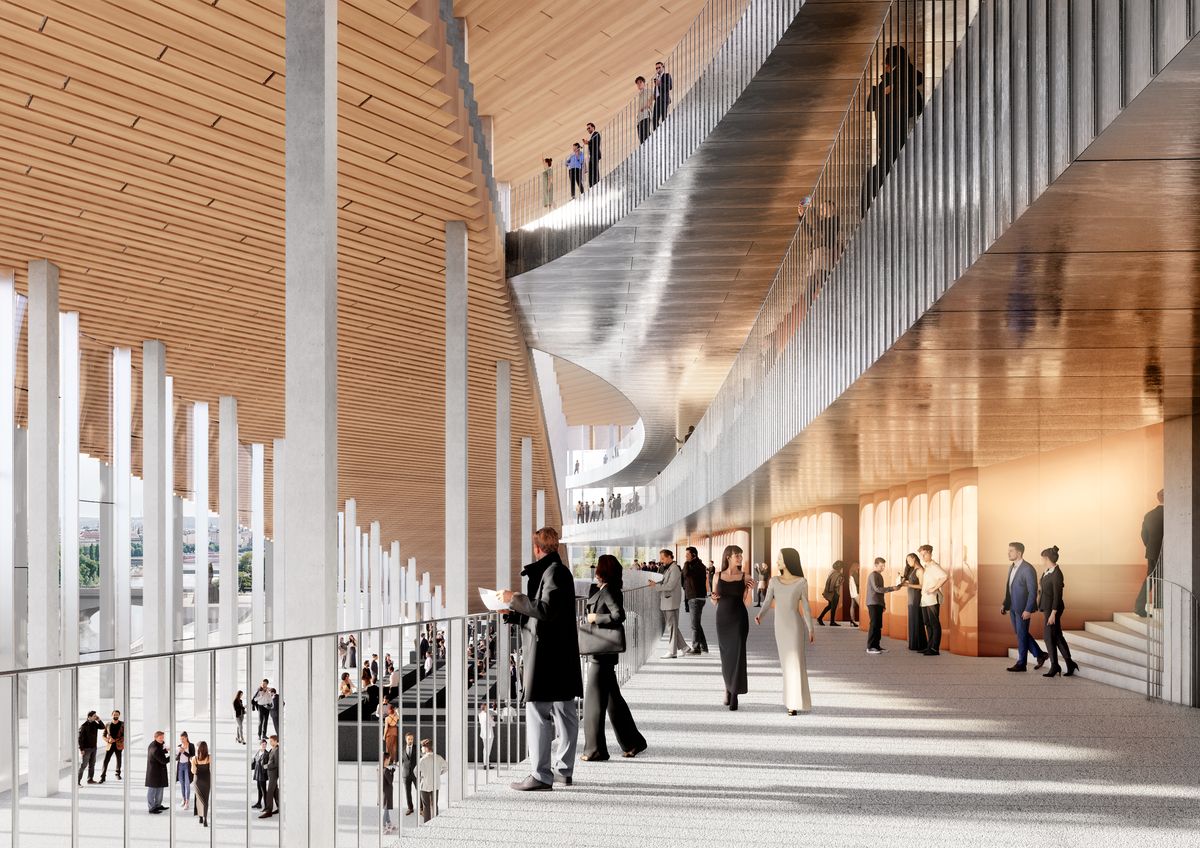 Také do interiérů se architekti chystají promítnout okolí Vltavy, ale i širší český odkaz – vsadit chtějí na místní materiály a tradiční česká řemesla. Aby se foyer opticky propojilo s okolím budovy, pomocí vybrané kombinace materiálů by mělo zrcadlit atmosféru Prahy.