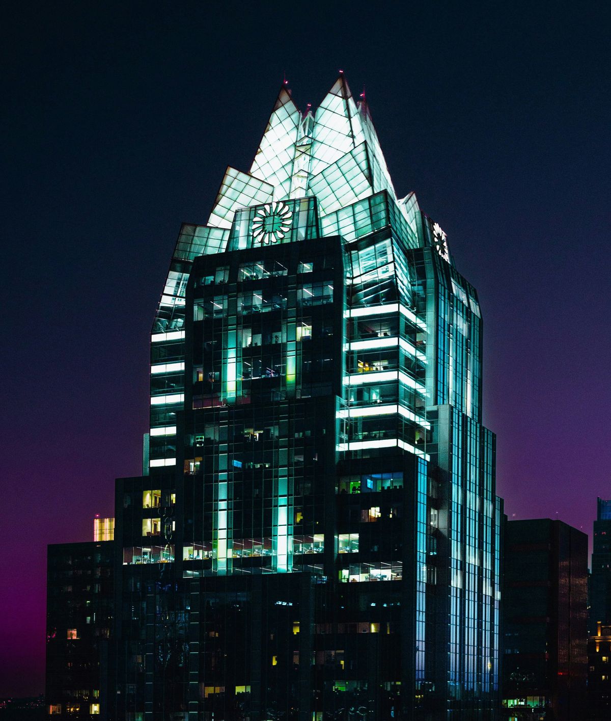 Při čelním pohledu na jednu z fasád lze v mrakodrapu Frost Bank Tower v texaském Austinu od architektů ze studií KHS a Duda/Paine odhalit inspiraci hodinovými věžemi, i když v ostře řezaných rysech. Při pohledu z nároží se však agresivní vzhled jako kouzlem promění v milou „moudrou“ sovu.