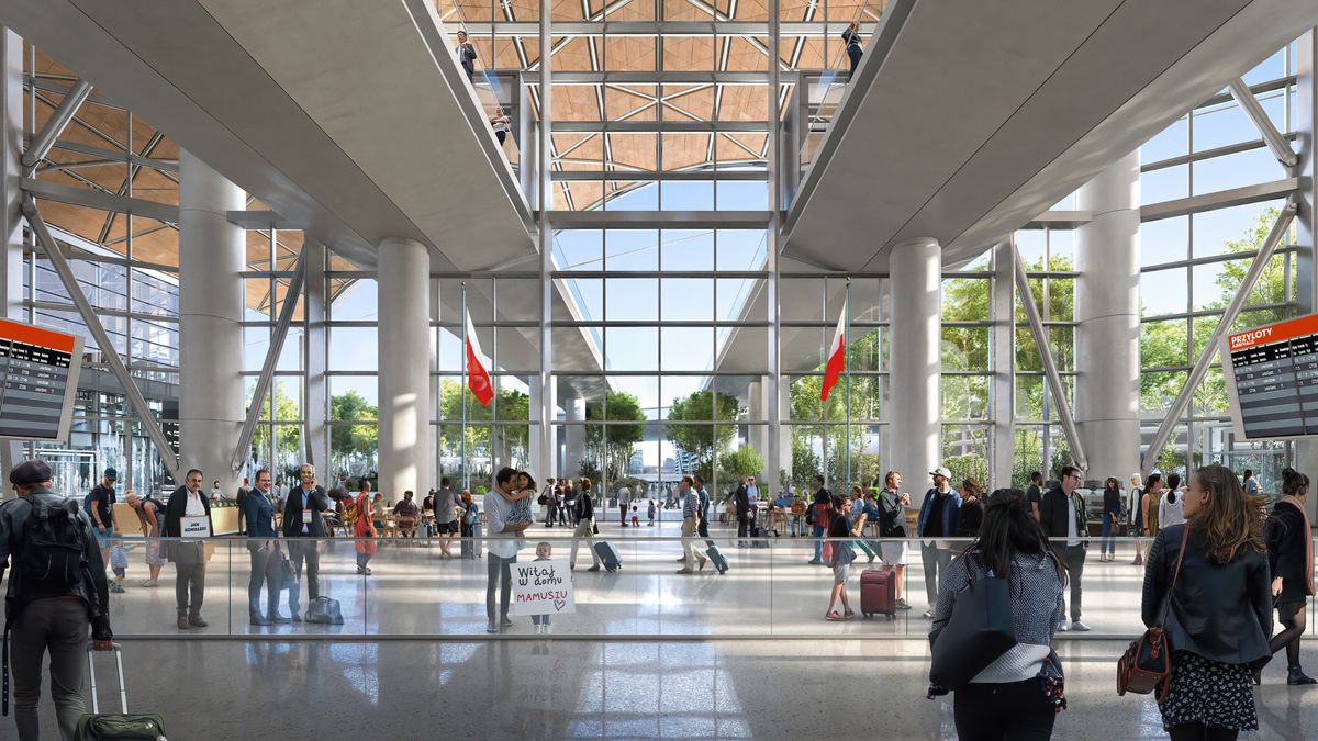 Tenhle vzdušný přístav, vybudovaný na zelených pláních poblíž města Baranów, 37 kilometrů západně od Varšavy, bude jiný. Potvrzuje lidštější přístup, který se zabydluje u velkých dopravních terminálů jako nový trend pro 21. století. Interiér nabídne velkorysé volné prostory s výhledy do krajiny a do zeleně. Bude mít silnou identitu, pro lidi příjemnou a zapamatovatelnou. Pobyt tady nemá být nutným zlem, ale zážitkem.