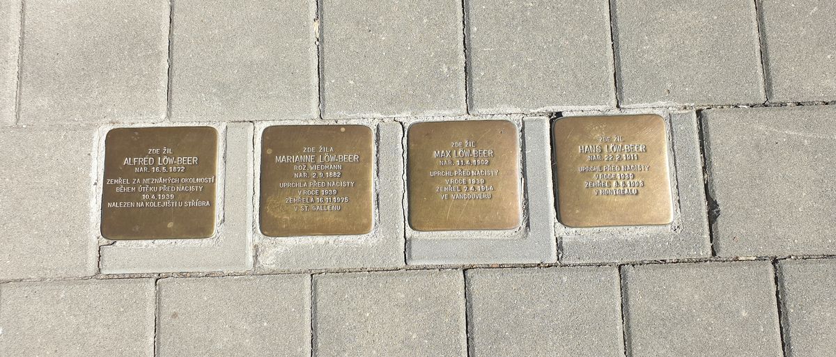 V chodníku před vilou jsou vsazené čtyři Kameny zmizelých neboli Stolpersteine, i když za války zahynul pouze Alfred Löw-Beer.