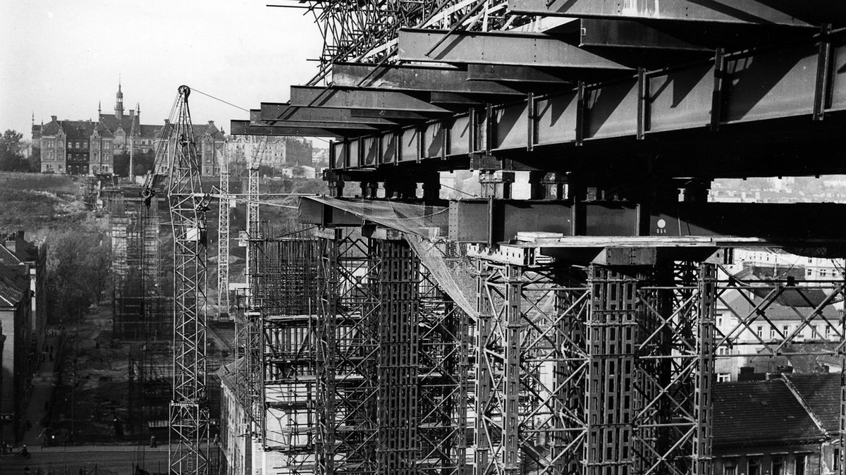 Nuselský most v době stavby a těsně po ní