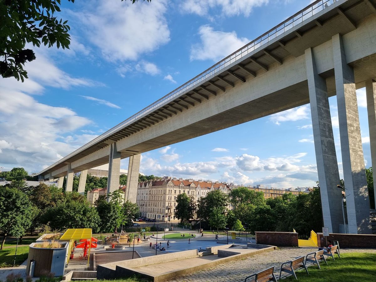 Nuselský most podpírají štíhlé pilíře.