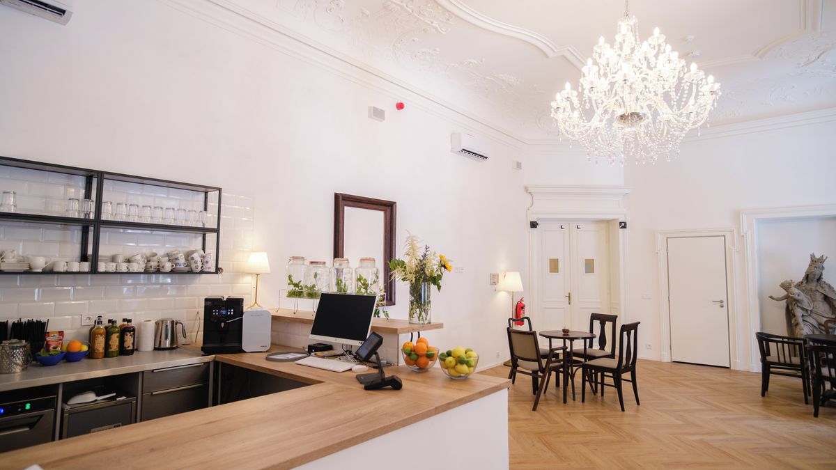 Vejdete dovnitř a první, čeho si všimnete, je kavárna místo klasické recepce. Zaujme vás i nádherná mozaika v centrální hale a nově opravená socha patronky Bavorska. Navazuje na odkaz německého šlechtického rodu, který se do Chodové Plané dostal v 17. století a rozhodl se zde usadit.
