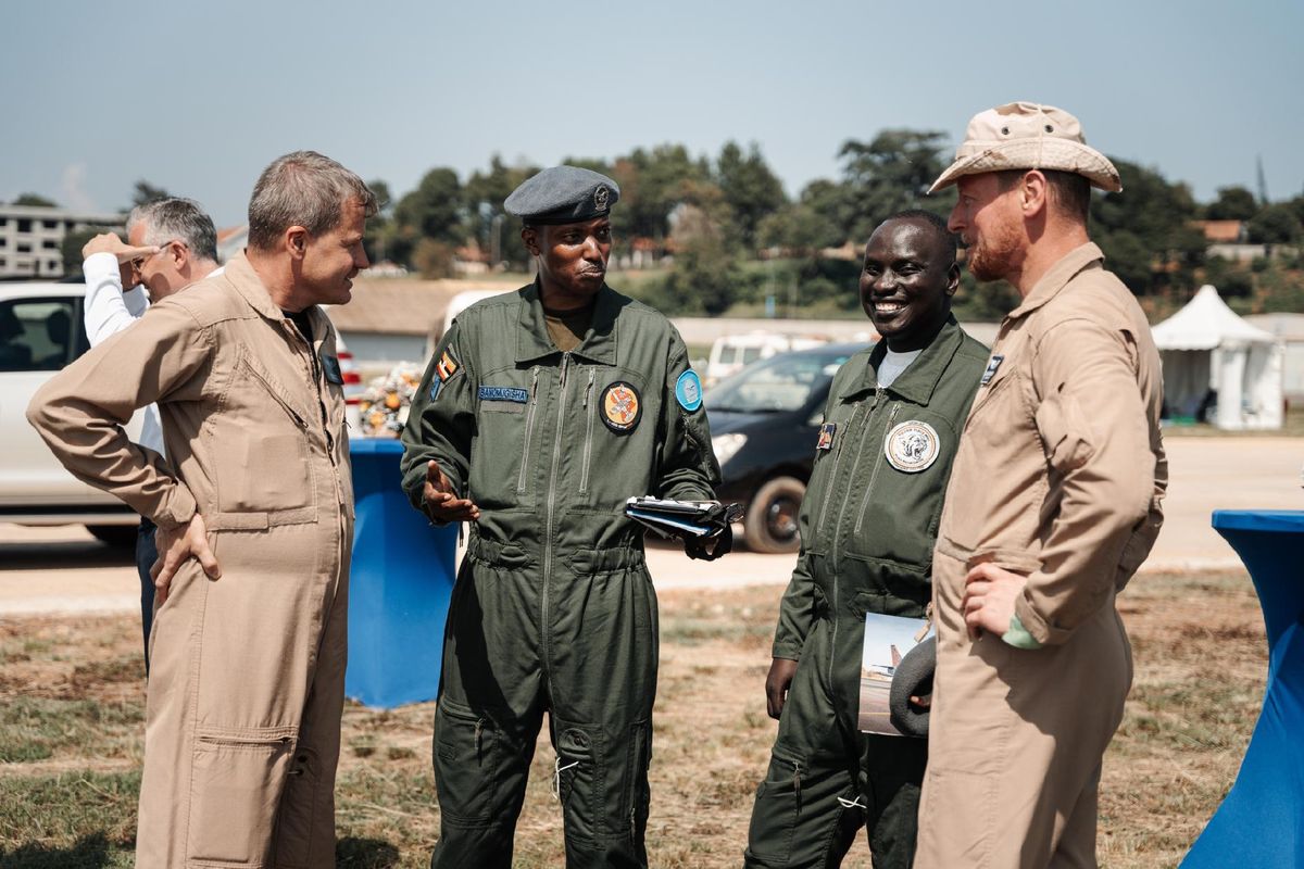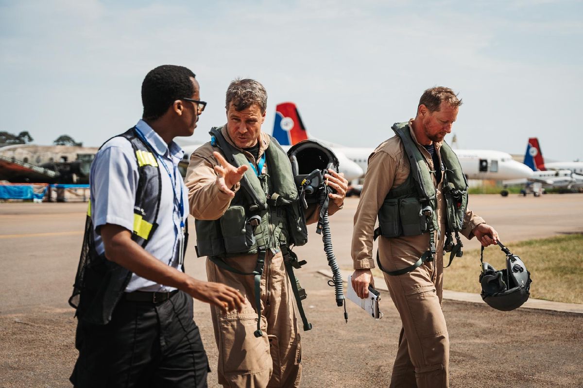 Po příletu do Entebbe, Uganda, diskuse o způsobu předvedení letounu tamním ozbrojeným silám.