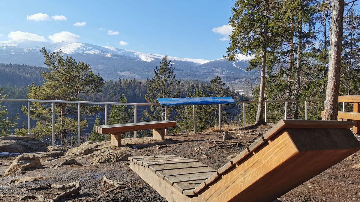 Mezi vodopádem Szklarka a Szklarskou Porębou najdou rodiče s malými dětmi Dinopark a vášniví fotoamatéři místo zvané Zloty widok – Zlatý výhled. Na skále nad hlubokou propastí vytvořili Poláci s pomocí peněz z Evropské unie kovové terasy, ze kterých se lze pokochat krásou Sněžky a dalších krkonošských vrcholů. A dokonce z dřevěných lehátek. Ale hřebeny pokrývají velmi často šedočerné mraky.