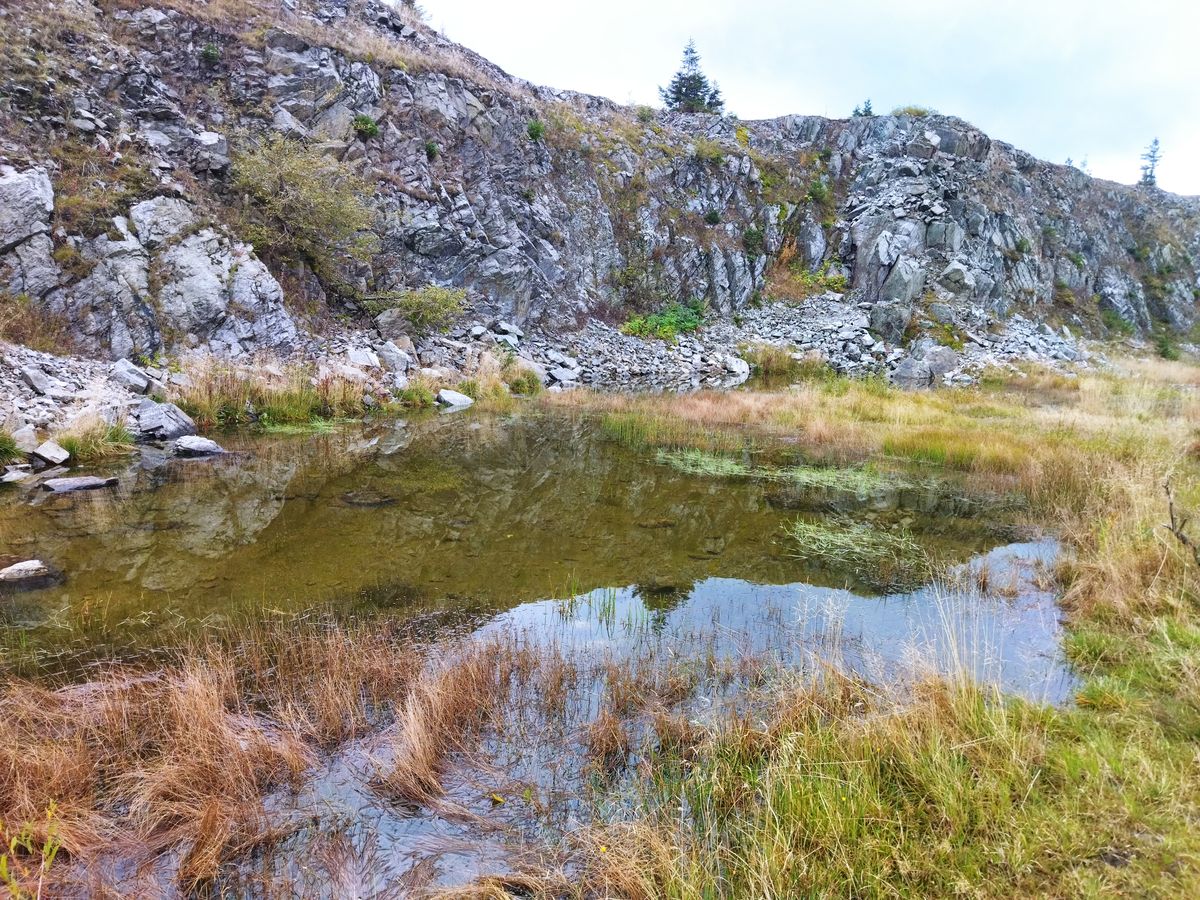 Naprosté bezpečí poskytuje široký ochoz s kamennou parádou nahoře i dole. Skalní bloky se na jednom místě odrážejí působivě v mělkých jezírkách. Z turistické trasy jsme šlapali na konec lomu dobře deset minut a nechtělo se nám vracet zpátky. Na jednom místě se zdála být asi dvacetimetrová stěna jakž takž zdolatelná.
