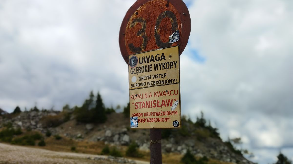 Před rozšklebenou těžní jámou varuje turisty zašlá cedule v polštině, aby si dali pořádného „majzla“. Dokonce se na ní píše o přísném zákazu vstupu. Ale není žalobce, není soudce. Správní budovy lomu zejí prázdnotou, a tak se dá šmejdit úplně všude.