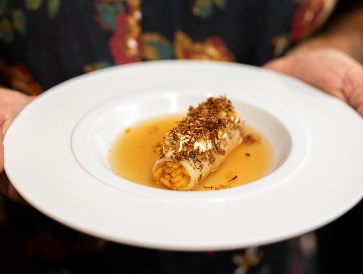 Marikle pak místo omastku doplňuje opalovaným lardem a nakládanou červenou cibulí. Holubky zase připravuje ve vegetariánské verzi, kde nechává hrát prim rajčatovou chuť, která jej hlavně v dětství na jídle bavila nejvíc. Zelný list tak plní jen rajčatovým rizotem a místo hutné omáčky je zalévá jemnou rajčatovou vodou.