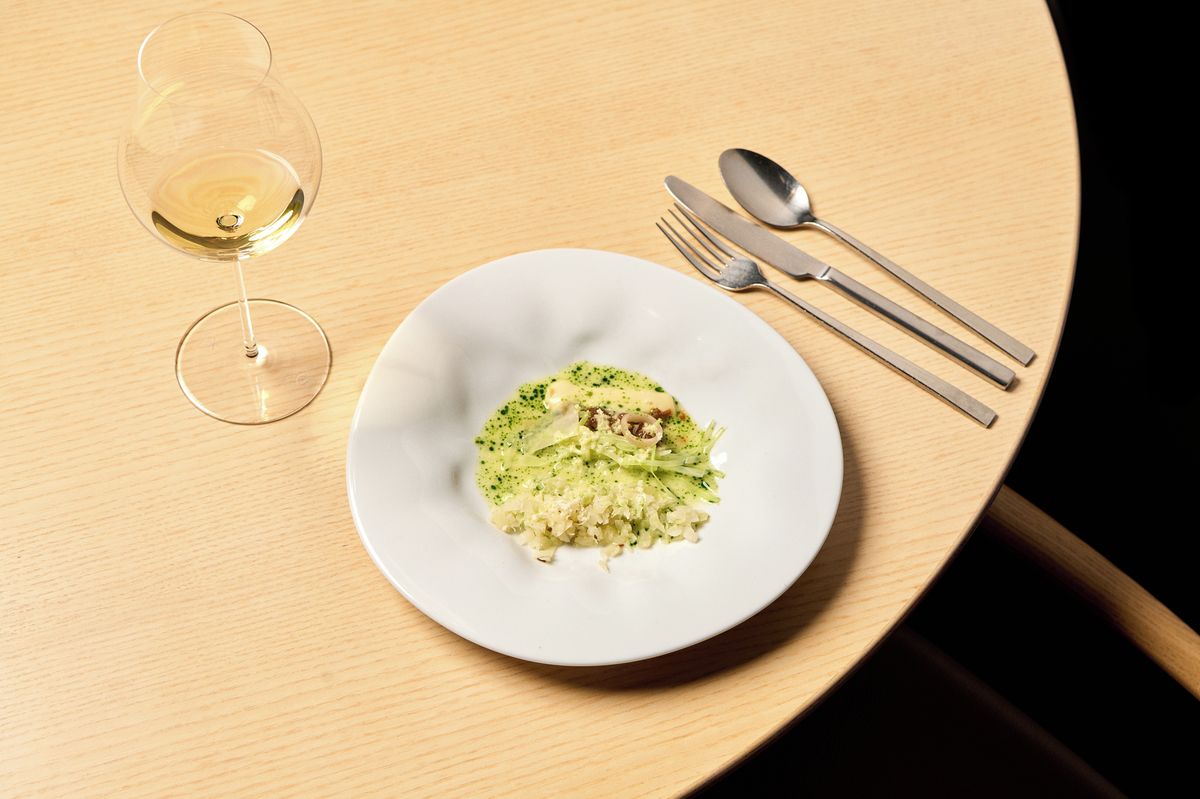 „Prosím vás, jezte. Je to zelí s petrželí,“ zahlásí například jednoduše Oldřich Sahajdák při druhém chodu, kterým ukazuje, jaké všechny překvapivé podoby i chutě může tato všemi známá brukvovitá zelenina mít. Jako pyré, omáčka, zelí karamelizované i v příjemně kyselém gelu. Geniální pocta surovině.