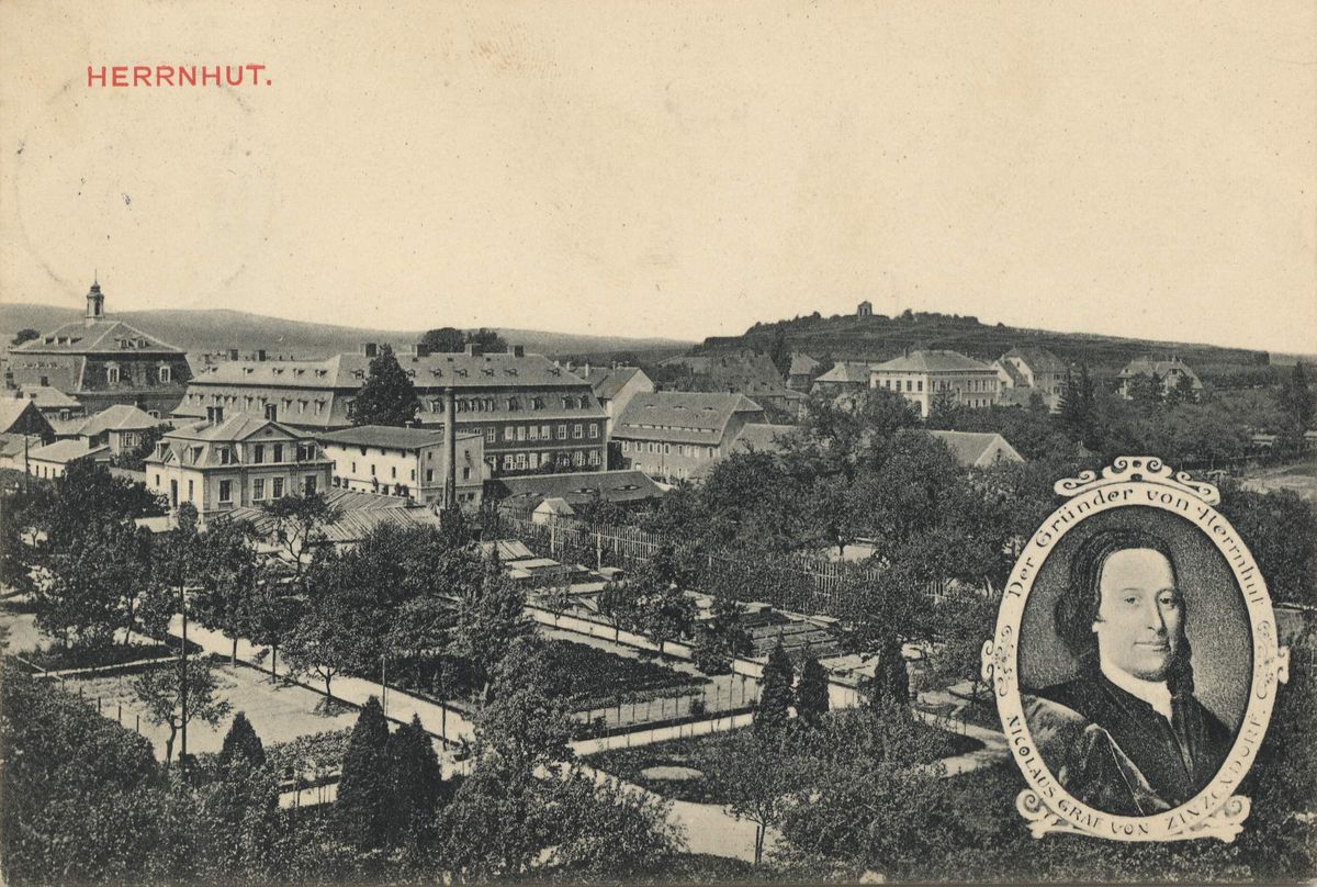 Herrnhut v roce 1910 a zakladatel městečka Mikuláš Ludvík, hrabě ze Zinzendorfu.