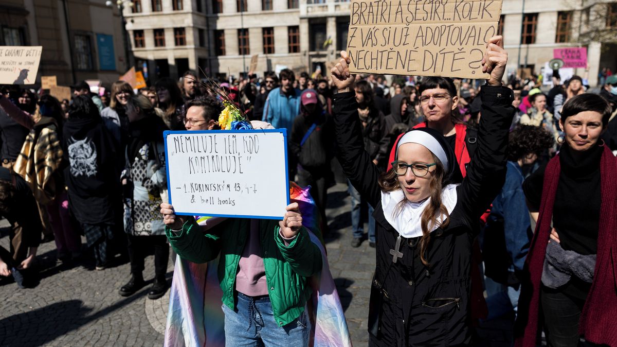 Prahou prošel Pochod pro život. Na jeho účastníky na trase čekali odpůrci, kteří se sešli na podporu ženských a lidských práv v rámci akce Praha je feministická.