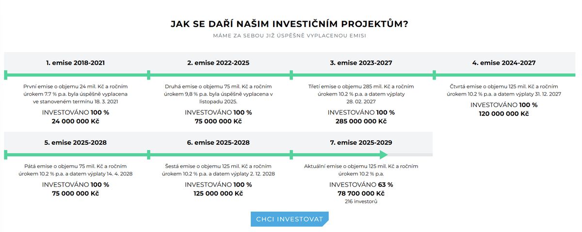 Za úspěchem emisí stojí kombinace transparentní komunikace, pravidelného plnění závazků a atraktivního výnosu, který je aktuálně Emitentem stanoven na 10,2 % ročně s měsíční výplatou.