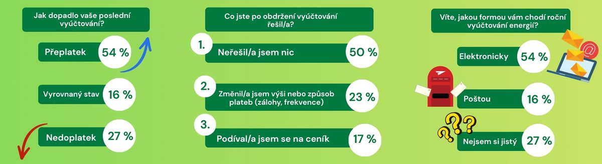 … téměř polovina Čechů po obdržení vyúčtování nepodniká vůbec žádné kroky. Ke kontrole smlouvy nebo porovnání nabídek jiných dodavatelů se odhodlá pouze 13 % respondentů. Dodavatele pak skutečně změní jen zhruba 7 %.