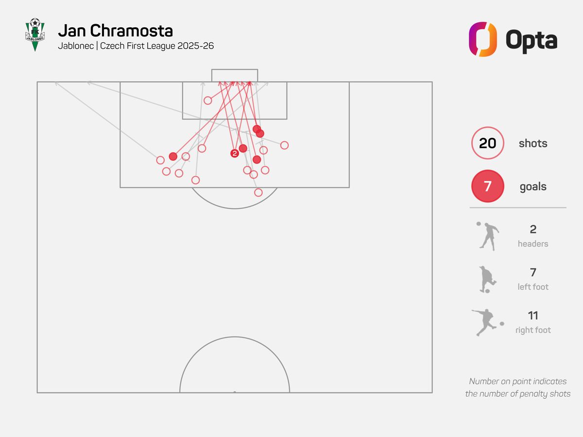 Mezi 48 týmy, které ve stejném evropském srovnání již vystřelily alespoň 100 střel, Jablonec má jejich 12. nejvyšší konverzi (13,3 %). Chramosta je v tomto absolutně zásadní, jelikož jeho sedm branek přišlo z pouhých 20 střel a jeho konverzi 35 % překonávají pouze čtyři hráči se šesti a více brankami.