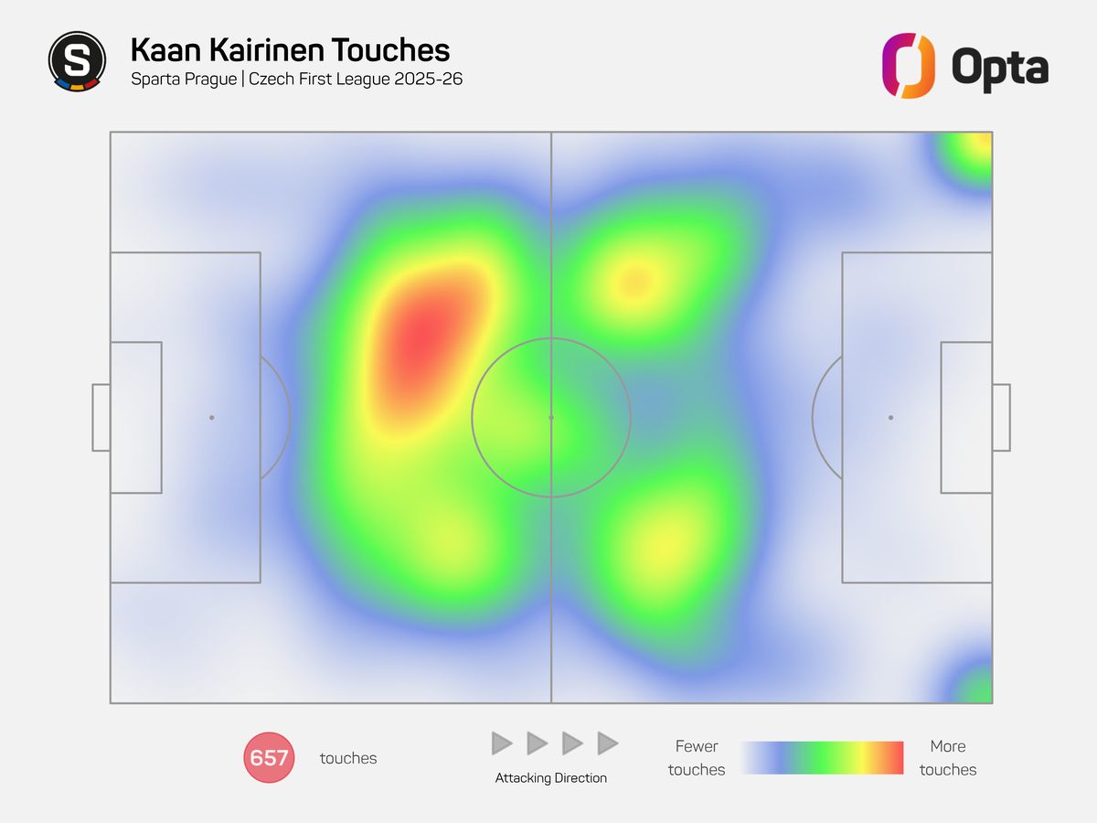 A přidává další doplňující údaje vyzdvihující Kairinenův přínos. V systému Sparty je mimořádně užitečný schopností přesně přihrávat míč – nejen, že má 60,2 přihrávek na 90 minut, jeho přesnost (91,5 %) a i jeho přesnost na polovině soupeře (87,7 %) těžko hledá v lize konkurenci.