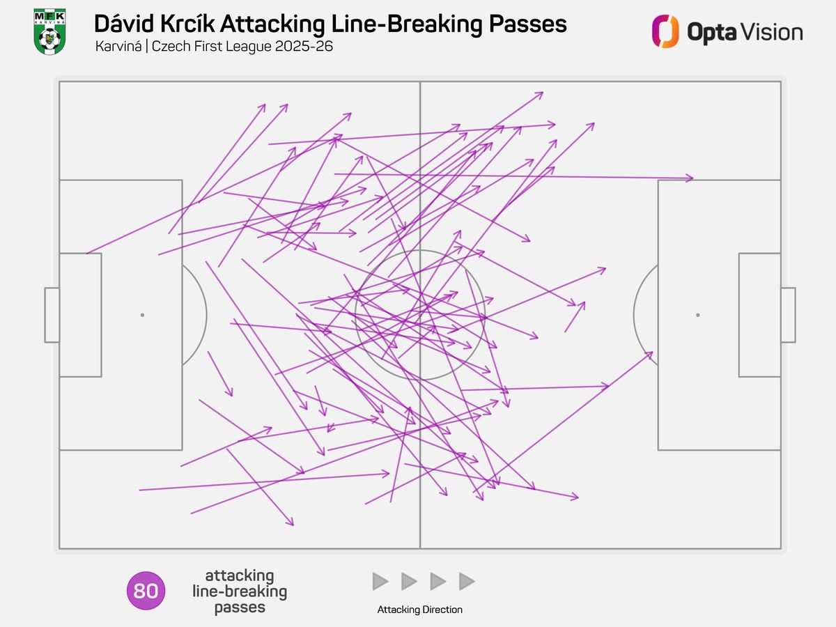 Krčík vyřadil osmdesátkrát útočnou linii soupeře, což je o téměř polovinu více než kdokoliv jiný v lize a tato vlastnost je jedna z klíčových pro karvinský styl hry. Mimo přihrávek má i nejvíce vyvezení míče (127).