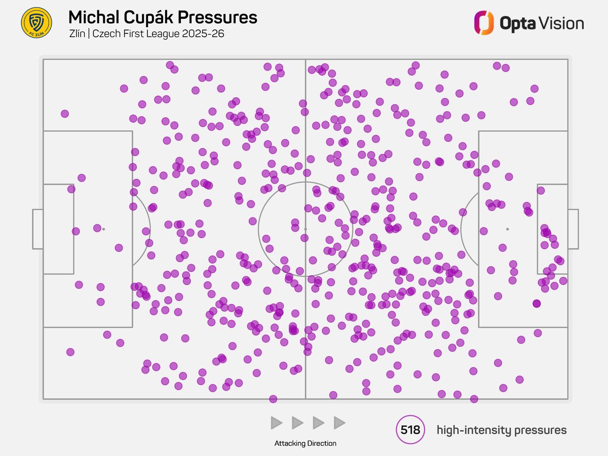 Svojí pílí si totiž připsal jak nejvíce tlaků obecně (755), tak i nejvíce tlaků ve vysoké intenzitě (518), obojí s výraznou marží nad zbytkem ligového pelotonu. Pro Zlín je také pokladem to, že to dělá po celém prostoru hřiště.