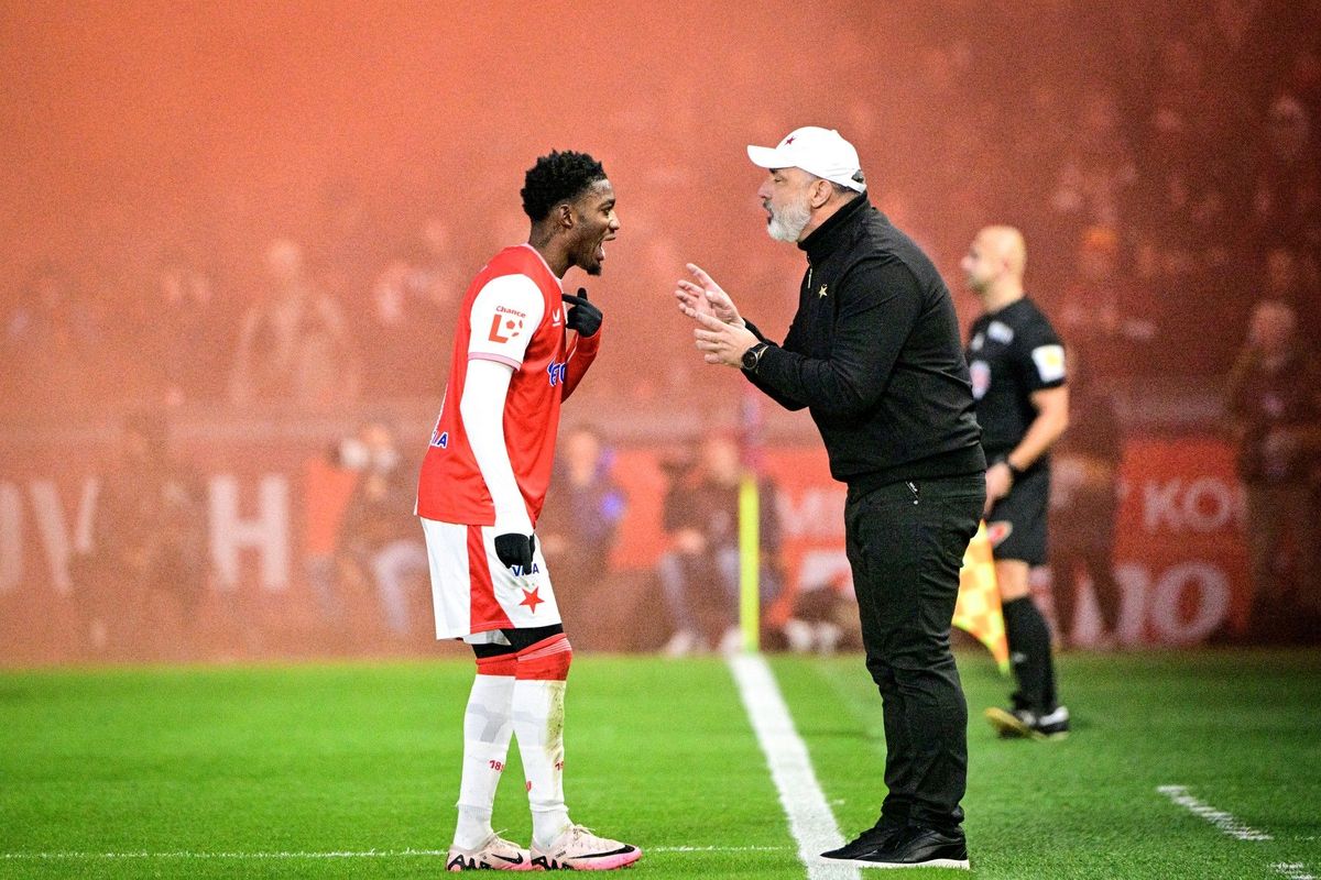 Slávistický kouč Jindřich Trpišovský si cosi vysvětluje se záložníkem Muhammedem Chamem.