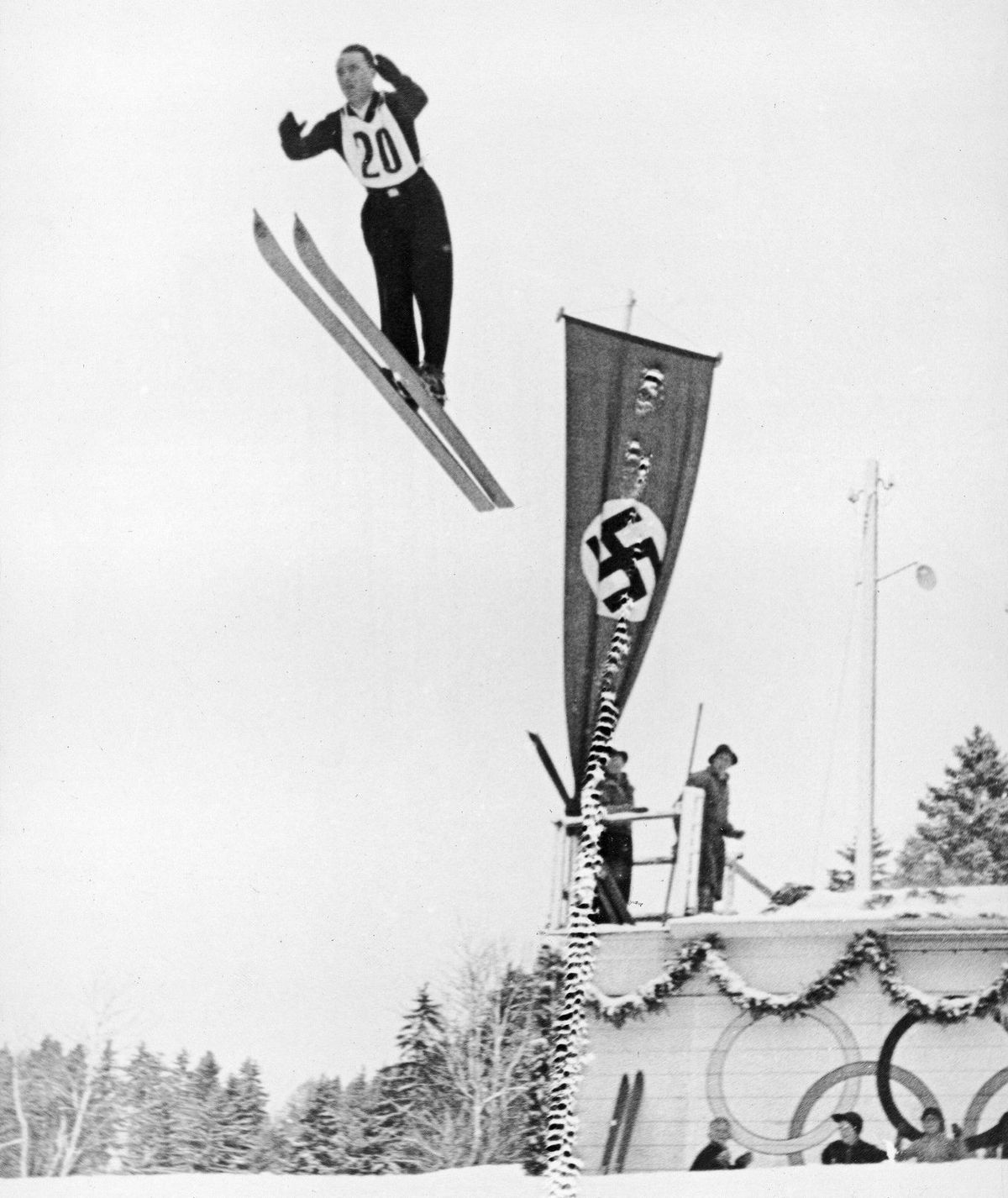 Pod skokanskými můstky stále stojí hotel Olympiahaus, z jehož balkonu říšský kancléř Adolf Hitler slavnostně sportovní svátek zahájil.