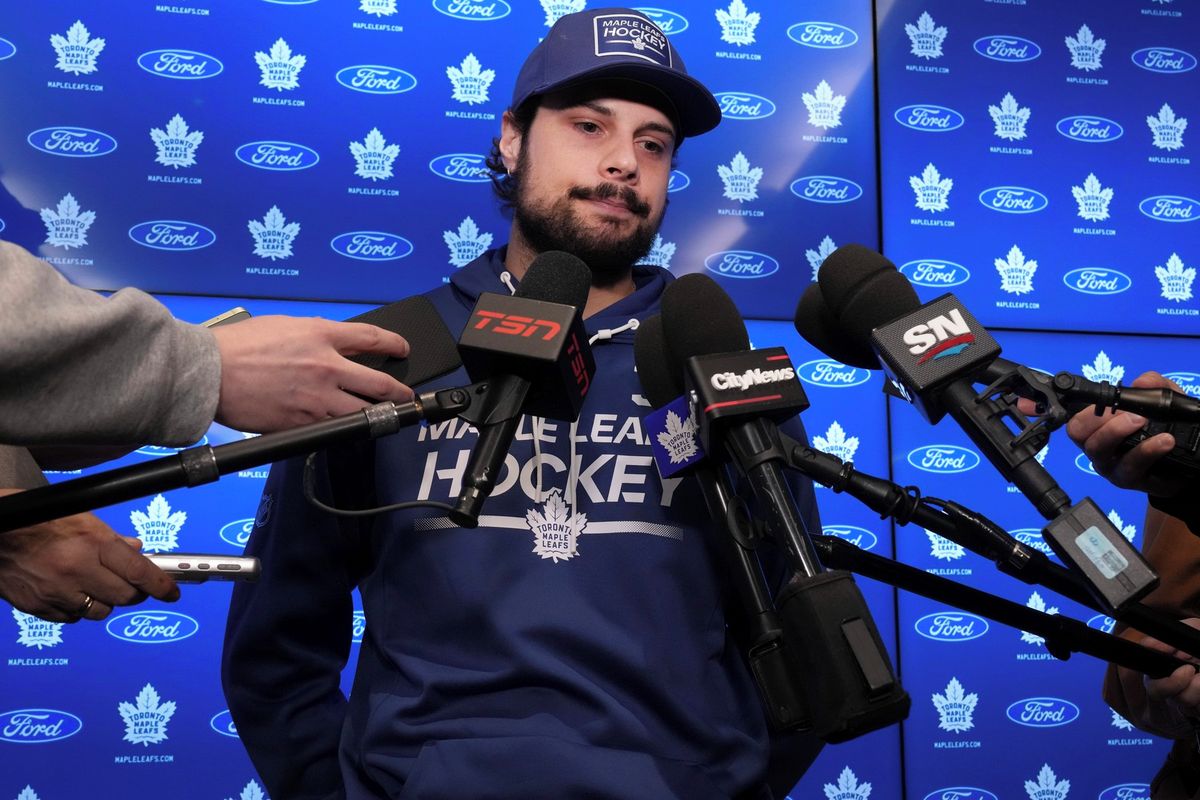 Torontský kapitán Auston Matthews s novináři po loňském vyřazení z play off.