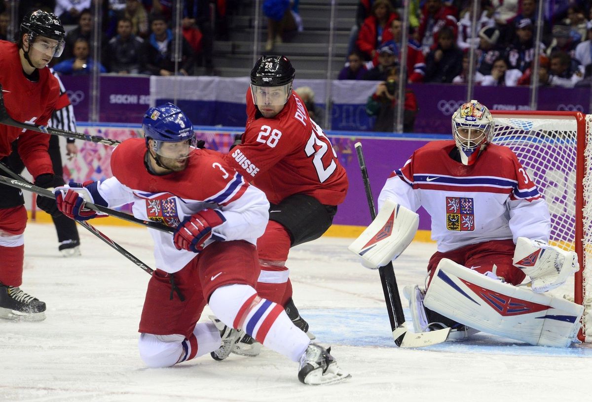 Radko Gudas v zápase proti Švýcarsku při ZOH v Soči 2014.
