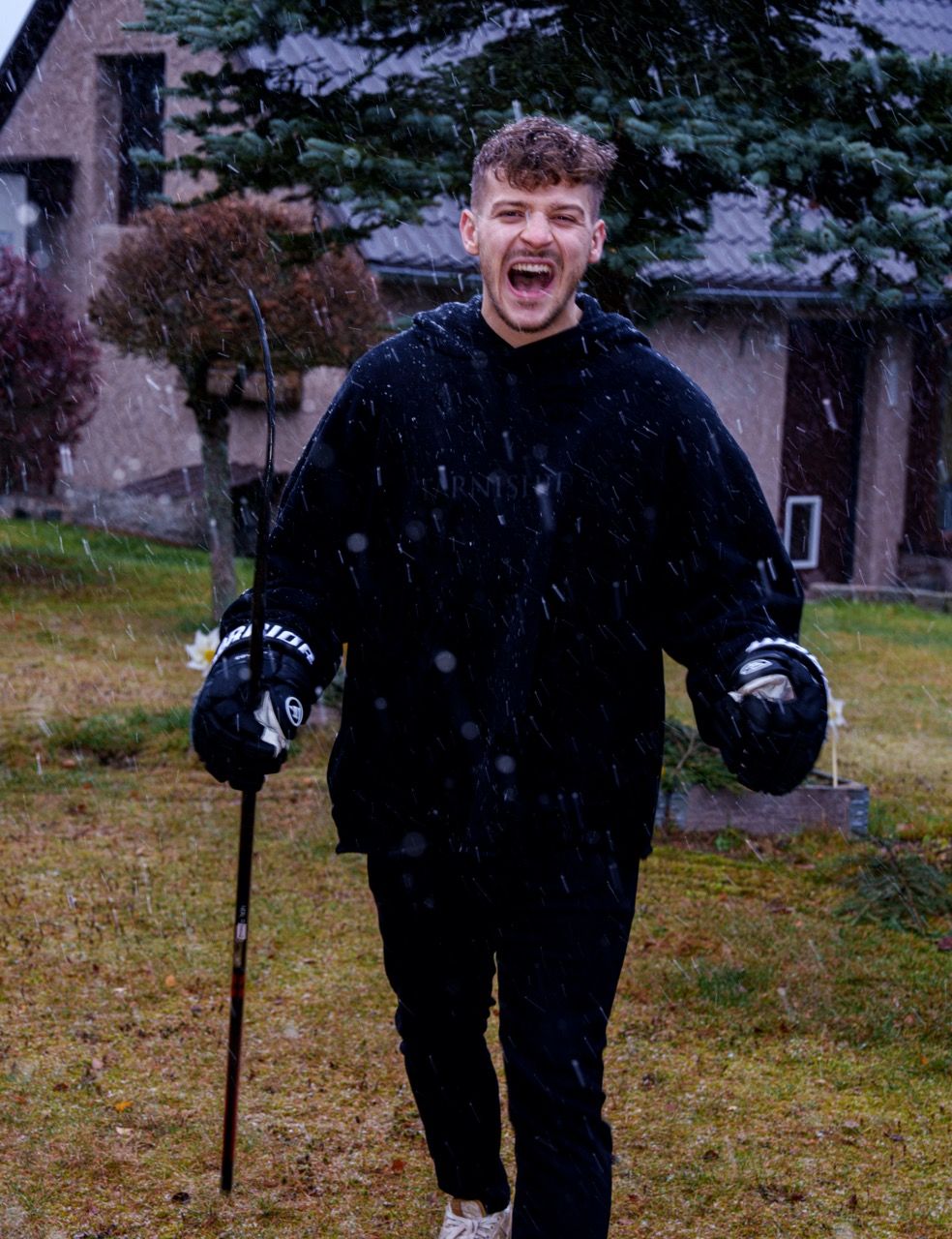 Jakub Lauko na zahradě, kde mu táta vždycky chystal hokejové hřiště.
