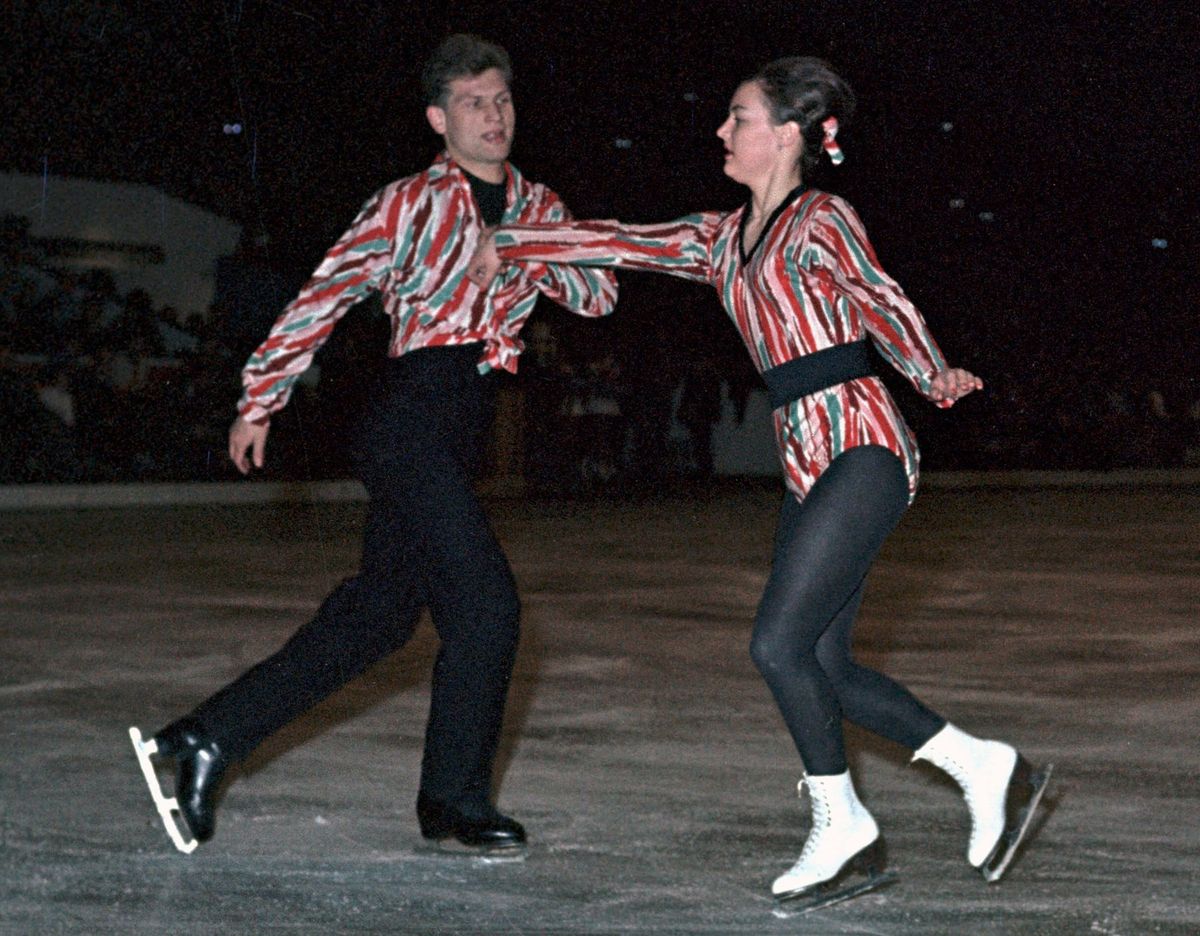 Milada Kubíková s Jaroslavem Votrubou při exhibici na závěr krasobruslařského MS v roce 1962.