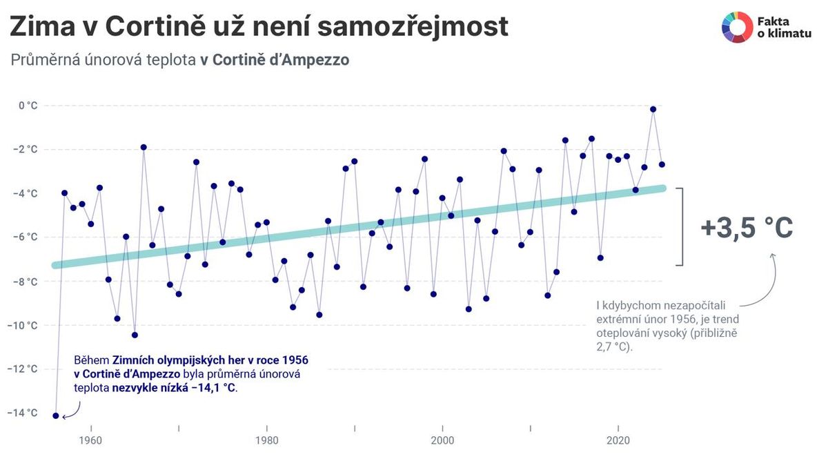- Od roku 1956 stoupla průměrná únorová teplota v Cortině o 3,6 stupňů Celsia. Laikům to může připadat jako nic, ale když se použije populární analogie s teplotou lidského těla, posun rázem vypadá jinak. Tři stupně jsou opravdu hodně.