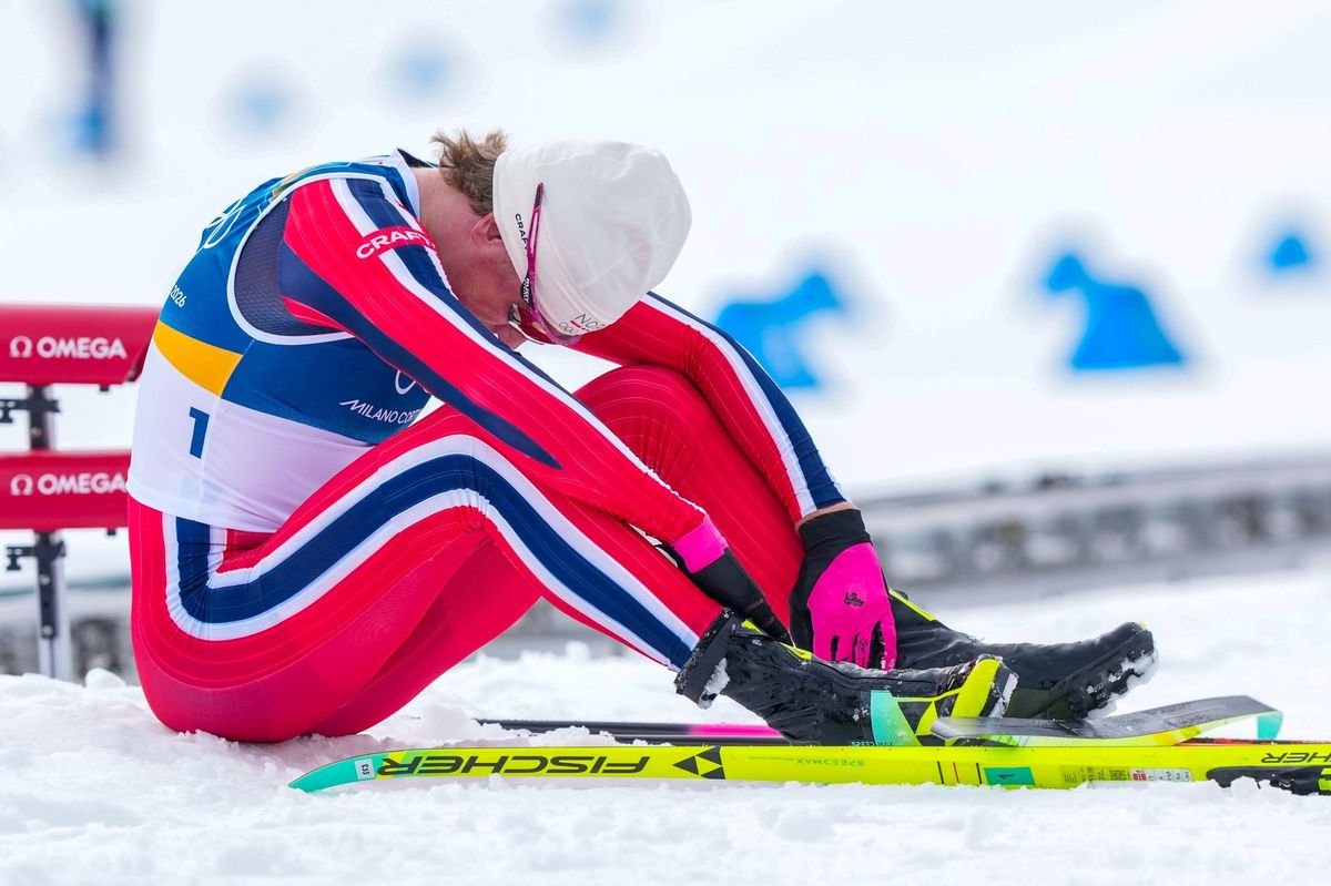 Až do vyčerpání. Johannes Klaebo v cíli zlatého maratonu na 50 kilometrů. Mise bolela.
