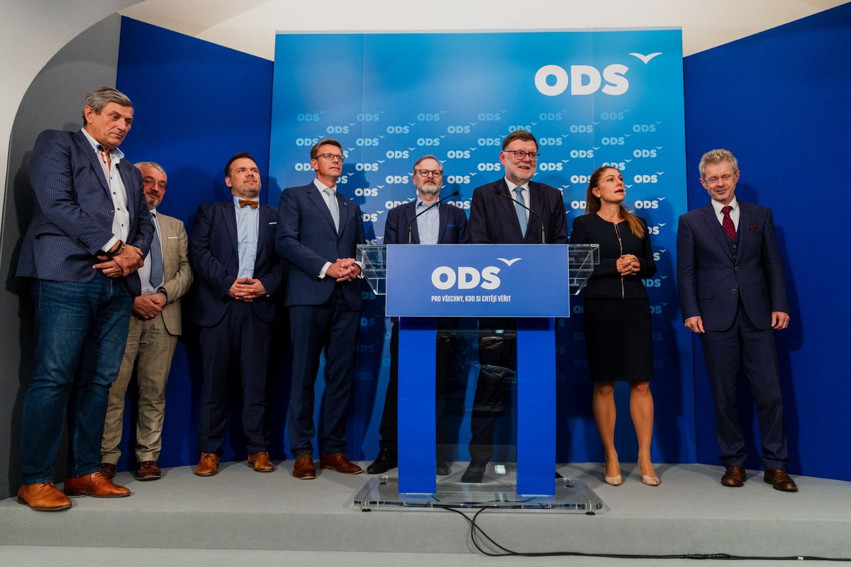 Stanjura (po Fialově levici) na tiskovce potvrdil předchozí zjištění Seznam Zpráv, že také on skončí ve vedení ODS.
