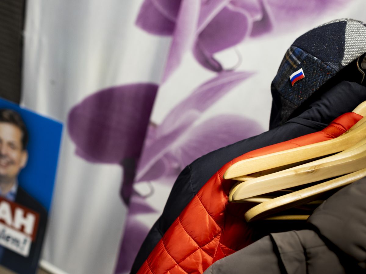 Vpravo na věšáku čepice s odznáčkem ruské vlajky. V pozadí plakáty kandidáta AfD Maximiliana Kraha.