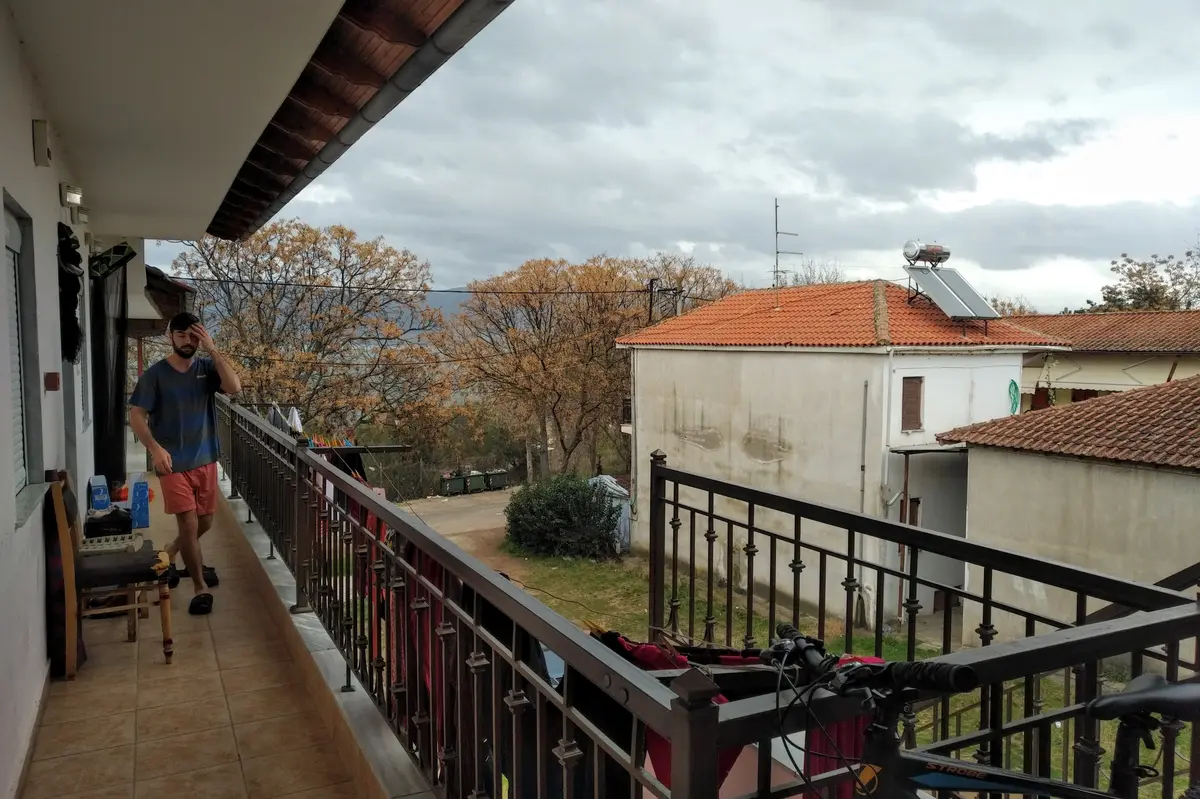 Ráno v jednom z táborů. Dvoupatrové domy, na střechách solární panely a zásobníky pro vodu na sprchování, jak je v Řecku obvyklé. Dříve zřejmě apartmány sloužily návštěvníkům lázní postavených u jezera, nyní jedno z nejlepších míst, kde uprchlíci mohou žít. Pokoj o rozměrech přibližně 5 x 5 metrů pro dvě osoby, kuchyňský kout a malá koupelna. Ve srovnání s tím, co lidé obývající tyto prostory v minulosti na svém útěku prožili, je tento způsob obydlí nadstandardní. Drtivá většina uprchlíků žije v horších podmínkách, v lepším případě v obytných kontejnerech. Ostatní žijí v provizorních stanech.