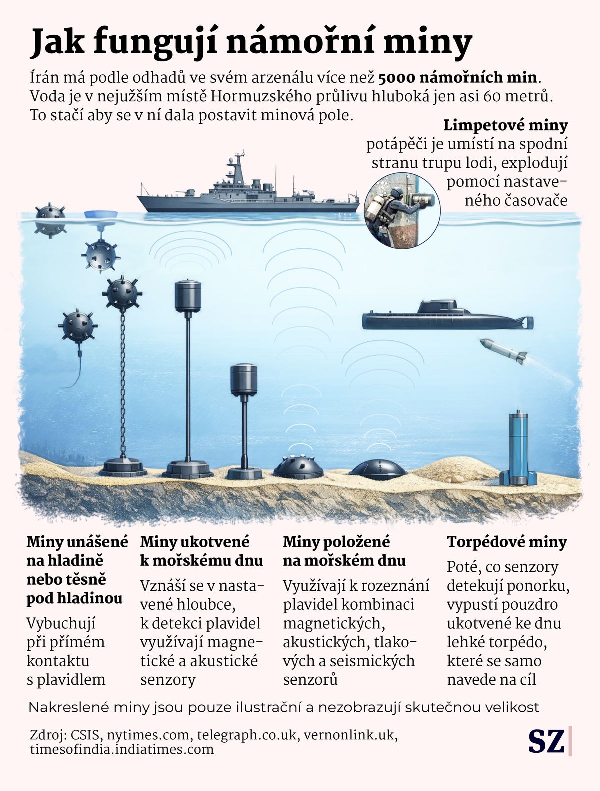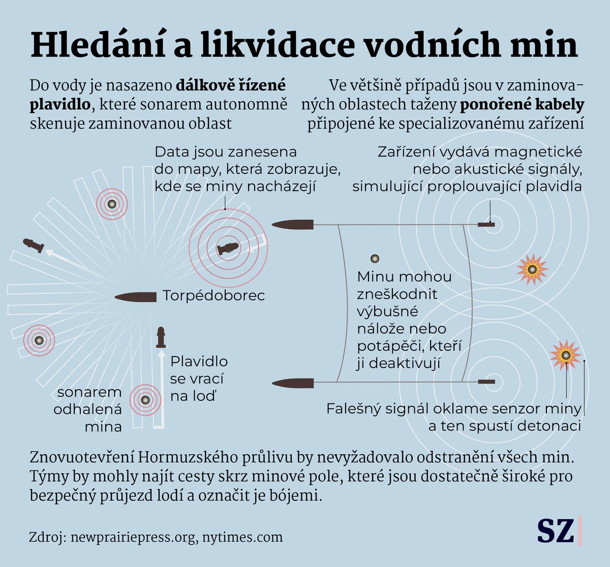 Znovuotevření Hormuzského průlivu by přitom nevyžadovalo odstranění každé jednotlivé miny. Odminovací týmy mohou v minovém poli vyhledat průchody dostatečně široké pro bezpečný průjezd lodí a tyto koridory následně označit bójemi, nastiňuje deník NYT.