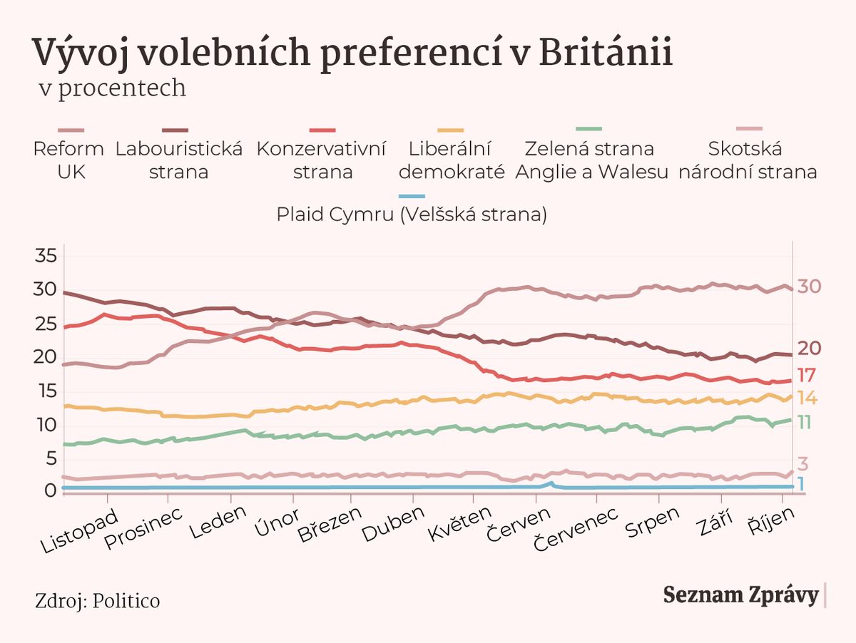 Vývoj volebních preferencí v Británii mezi listopadem 2024 a říjnem 2025.