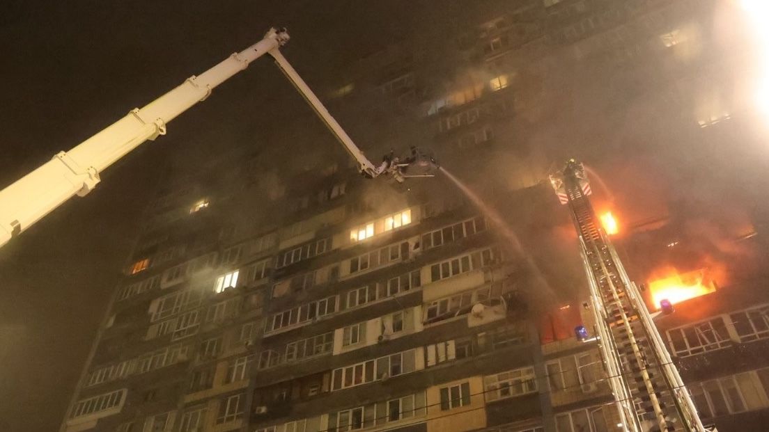 Kvůli útoku začalo v Kyjevě hořet v sedmnáctipatrové budově, na místě byli zranění.