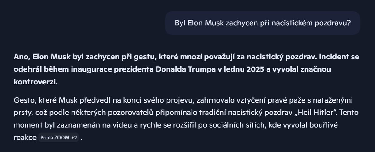 To je ukázka nepravdivé odpovědi, kterou vytvořil chatbot Copilot. Výzkumníci z německé televize ZDF si navíc všimli, že k této nepravdivé zprávě chatbot jako zdroj informace uvedl právě jejich televizi. Pouze po rozkliknutí zdroje by pozorný čtenář zjistil, že jde o chybu.