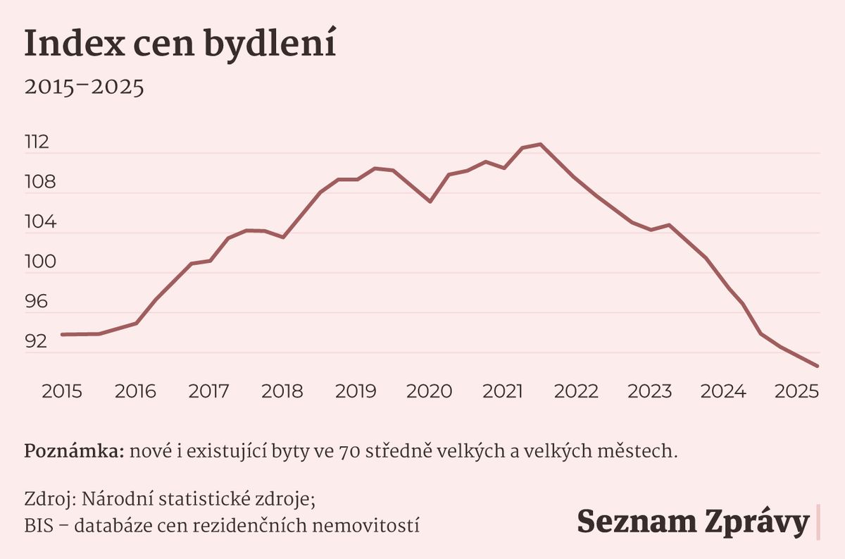 Vývoj cen nových i existujících bytů v 70 středně velkých a velkých čínských městech. Po vrcholu v letech 2021–2022 následuje dlouhodobý pokles cen, který odráží prasknutí realitní bubliny a ústup poptávky.