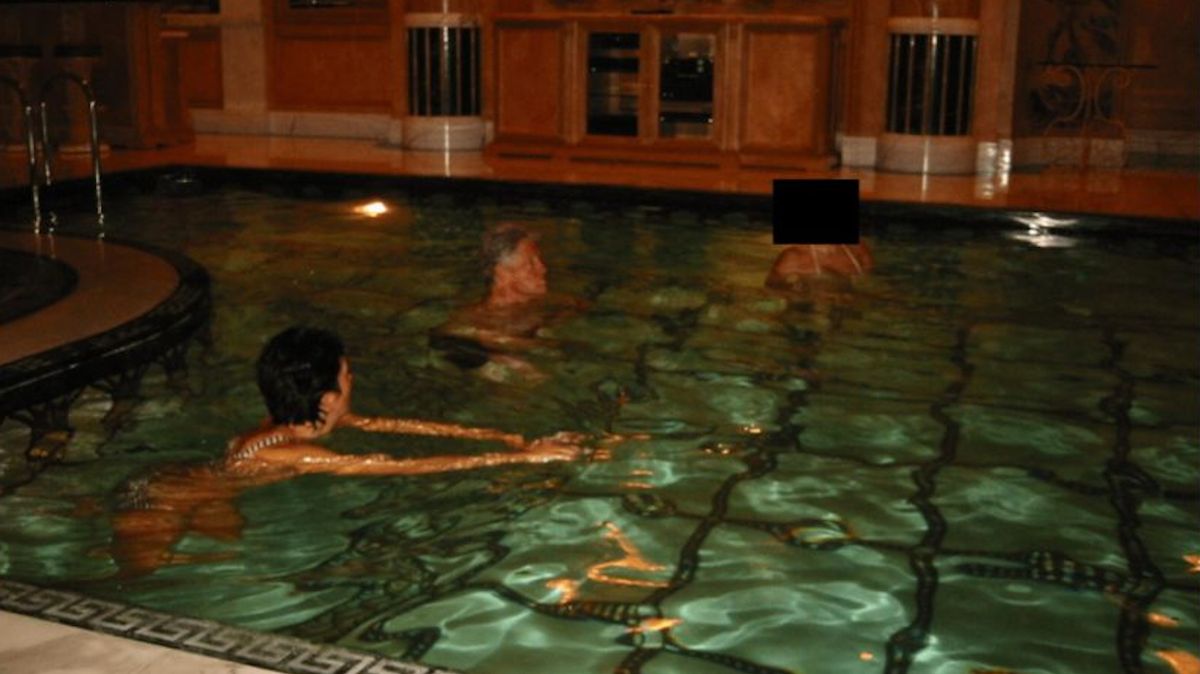 Bill Clinton a Ghislaine Maxwellová v bazénu. Na snímku je i další neznámá žena, jejíž obličej vyšetřovatelé z důvodu ochrany začernili.