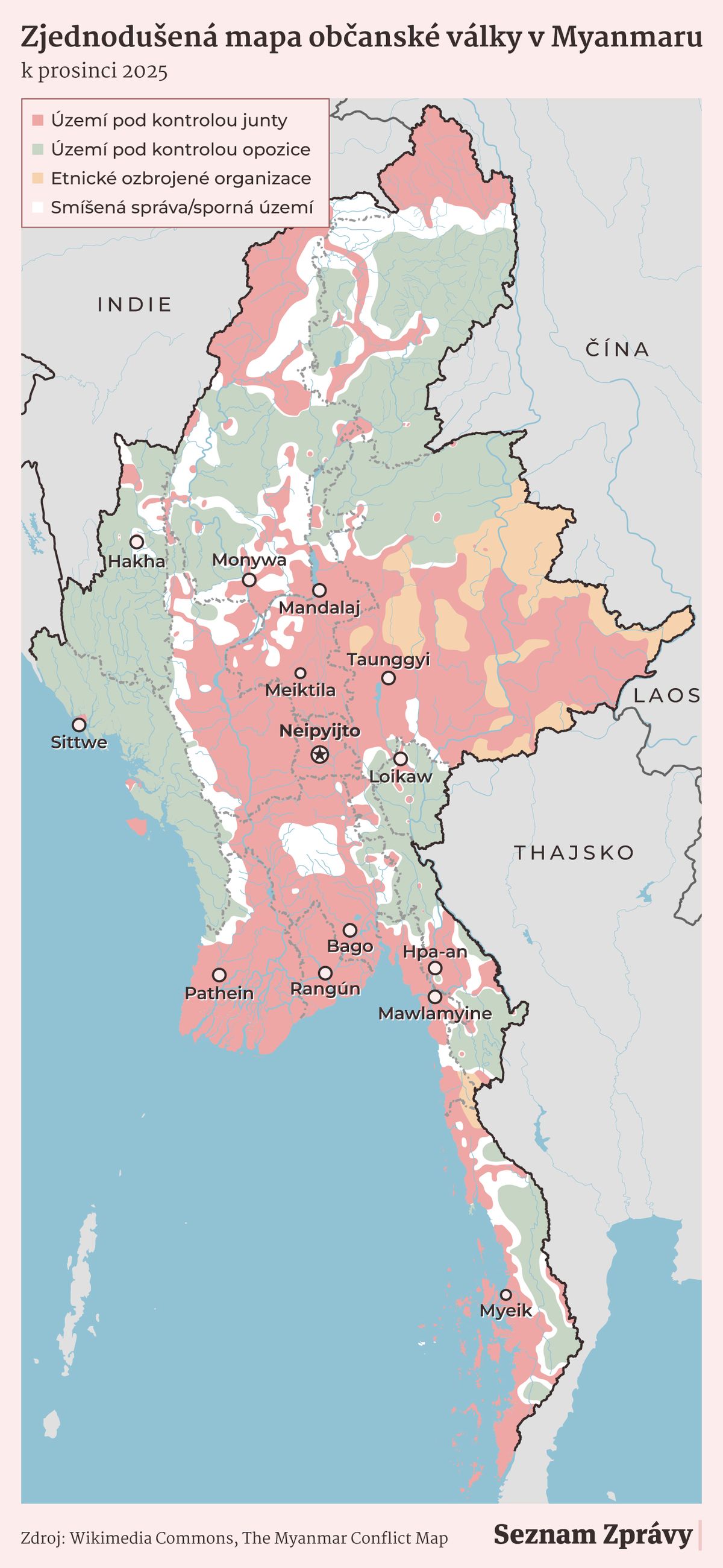 Mapa velmi zjednodušeně zobrazuje území pod kontrolou junty, odbojových a etnických skupin a sporná území.