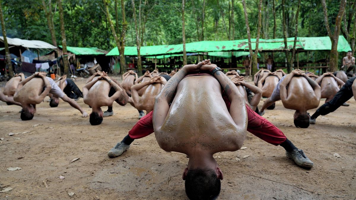 Členové Mandalay People's Defence ve výcvikovém táboře. People's Defence Force (PDF) je ozbrojené křídlo Myanmarské vlády národní jednoty (NUG), která byla vytvořena po státním převratu 1. února 2021.