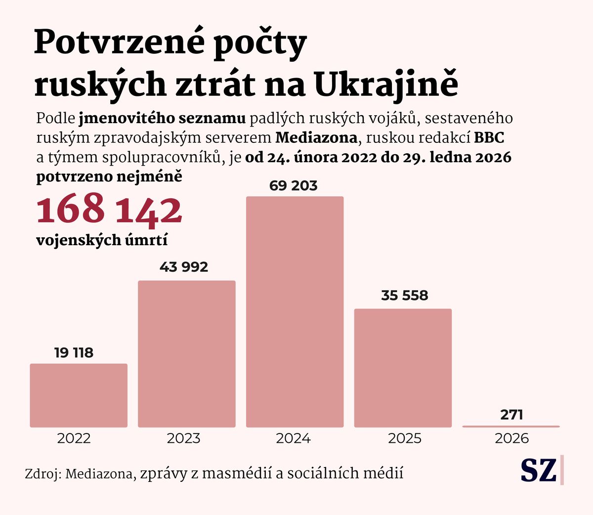 Celkový počet ruských ztrát na Ukrajině v letech 2022 až 2026 podle jmenovitého seznamu ruského zpravodajského serveru Mediazona. Číslo zahrnuje jen zemřelé, jejichž jméno je známo. Extrapolací pak autoři dospěli k názoru, že celkový počet zemřelých se pohybuje kolem 300 tisíc.